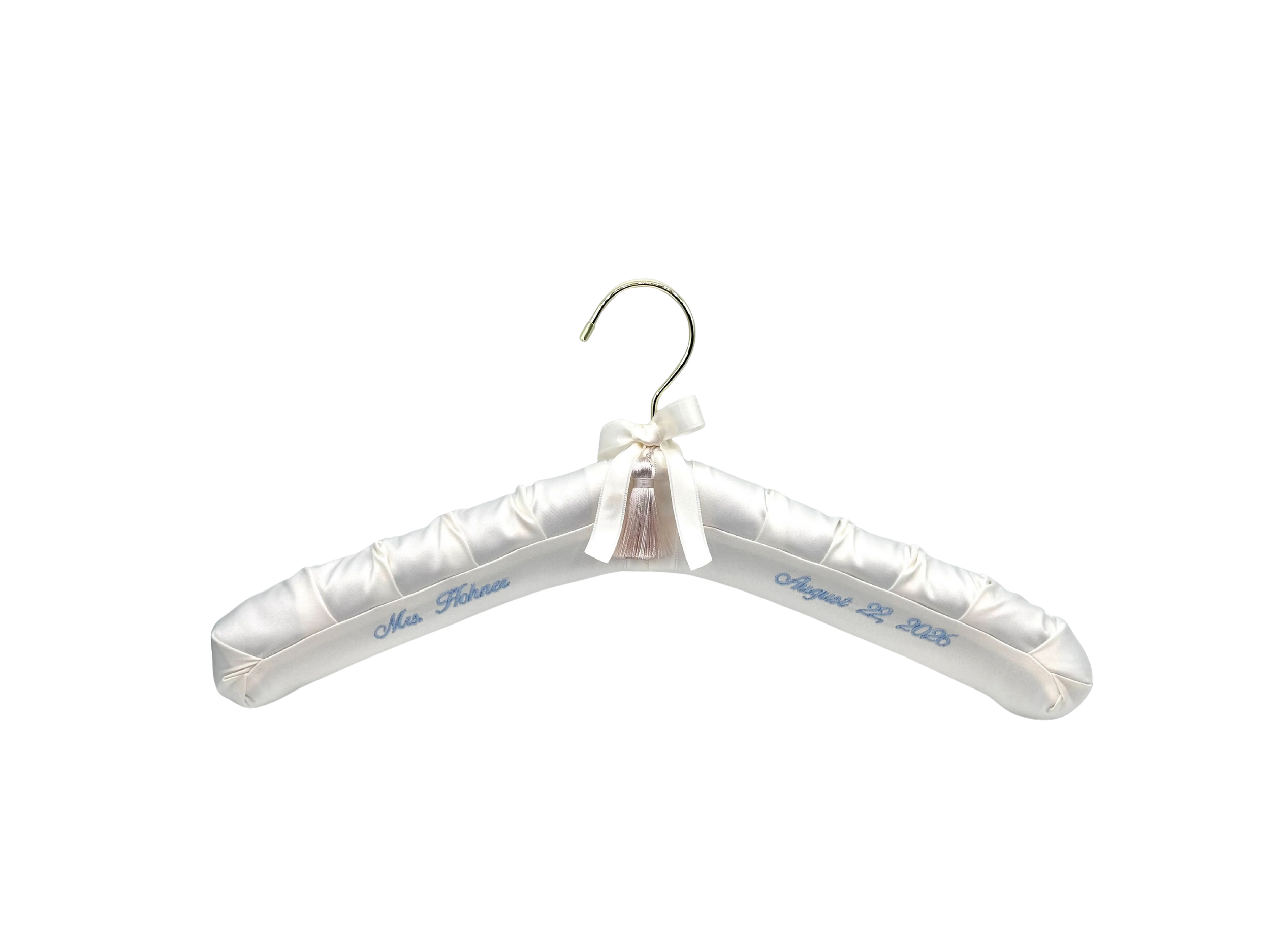Wrapped in soft batting and covered with luxurious satin, this hanger is as durable as it is beautiful. Brides love the bar-free design, making it ideal for even the most elaborate gowns. From the smooth touch of satin to the sparkling charm, every detail is thoughtfully curated to celebrate your once-in-a-lifetime moment.
